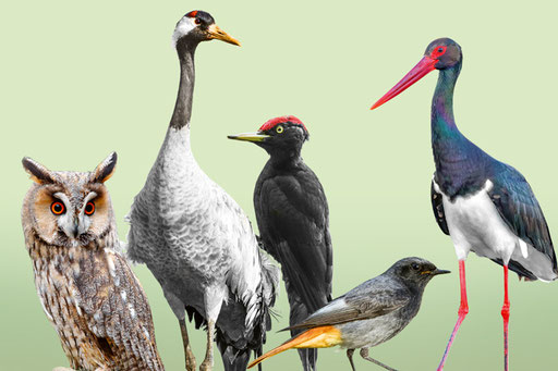 Hausrotschwanz: Dennis Lorenz/BIA; Kranich: Mario Suarez Porras/BIA; Schwarzspecht: Christoph Bosch; Waldohreule: Ondrej Prosicky/BIA; Schwarzstorch: Mathias Schäf